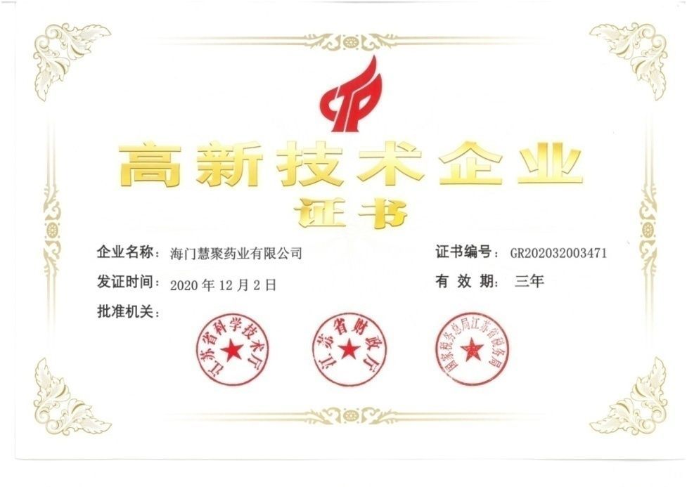 近日,慧聚药业收到由江苏省科技厅、江苏省财政厅、国家税务总局江苏省税务局联合颁发的《高新技术企业证书》。公司自2008年首次通过“高新技术企业”认定,这是慧聚药业连续第5次获得此项资质。此次通过高新技术企业的再认定,是对公司技术研发实力和科技成果转化能力的肯定,将进一步激励公司持续加大科研投入,激发公司自主创新的热情,在引入高精尖人才、提升科技创新能力、打造核心产品等方面持续发力,充分发挥高新技术企业的优势和引领作用。